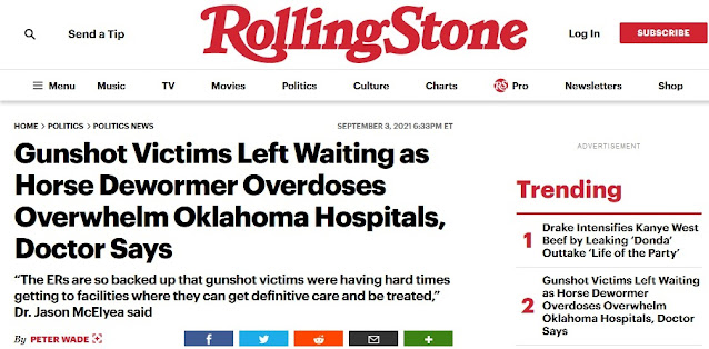 Example: A doctor in rural Oklahoma breathlessly called a TV station 180 miles away, claiming that not only were people overdosing on Ivermectin, the number of overdoses was so high that GUNSHOT VICTIMS had to wait for a bed in the emergency room of his hospital! So many that all the ambulances were being used to transport Ivermectin overdoses, so da po' gunshot victims couldn't even get to da hospital!!!! Where they would have had to wait to be treated, eh?